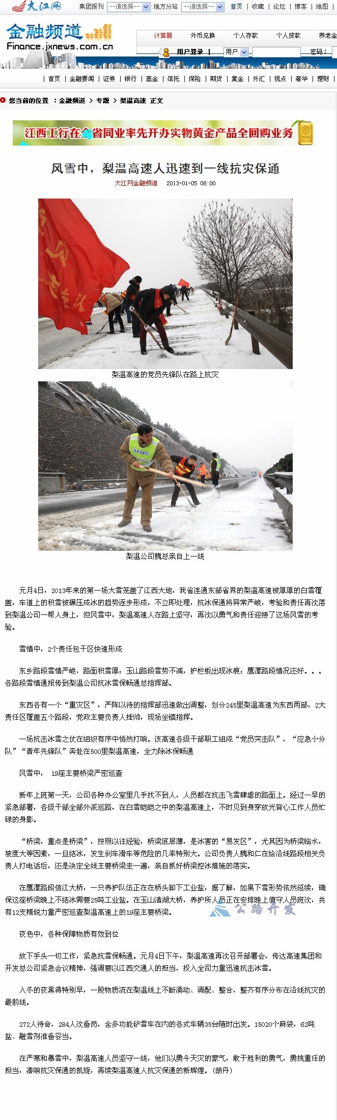 【媒体聚焦抗冰雪】大江网金融频道:风雪中,梨温高速人迅速到一线抗灾保通