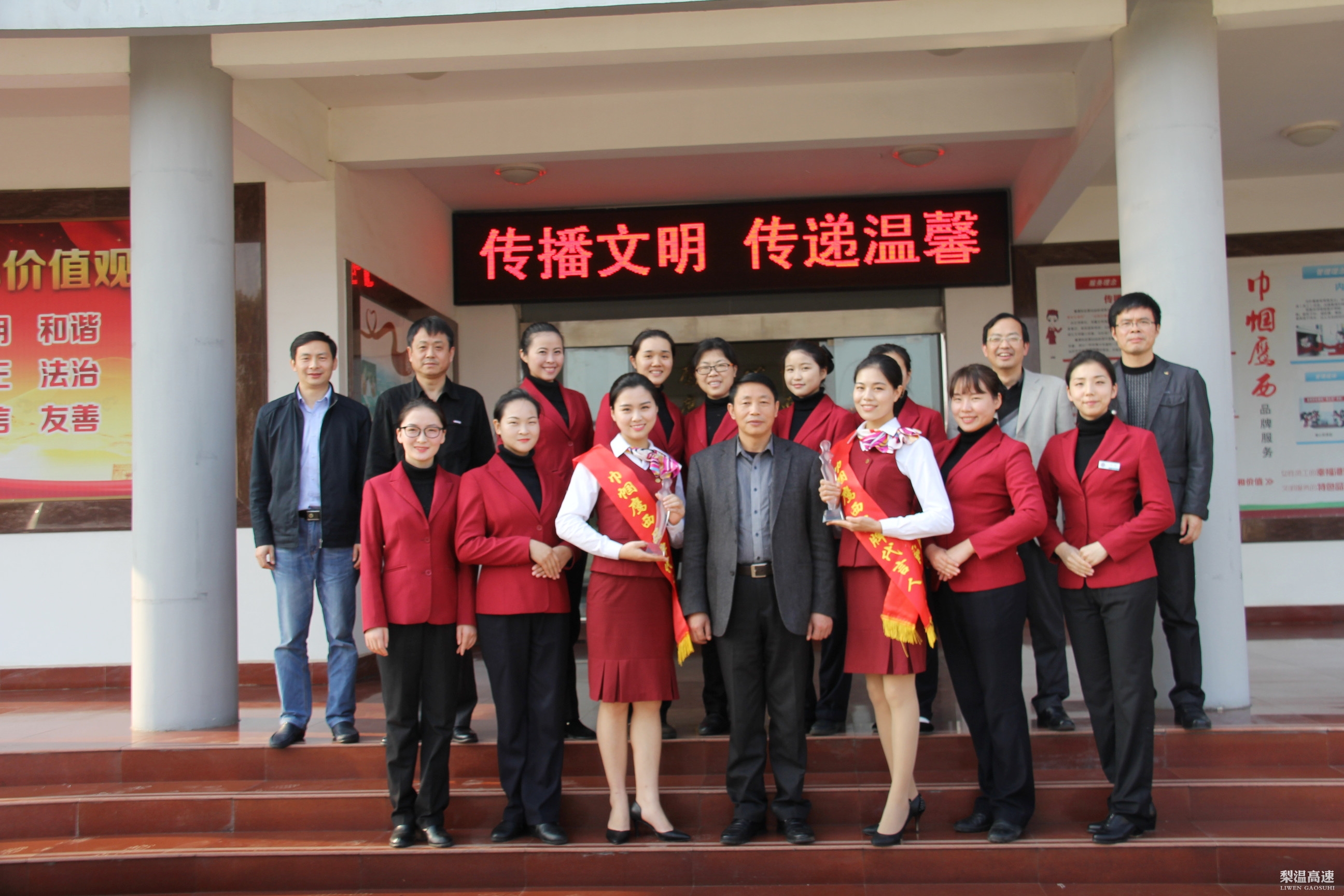 3月19日,梨温高速鹰潭西收费站2015年度品牌形象代言人活动进行表彰,公司党委书记周洪达为活动选拔出来的两名代言人颁发奖杯和授带,并代表党委对鹰潭西收费站作出的贡献表示感谢。纪委副书记梅水平、党委办公室主任梅春华,鹰潭管理处党政负责人参加表彰活动。