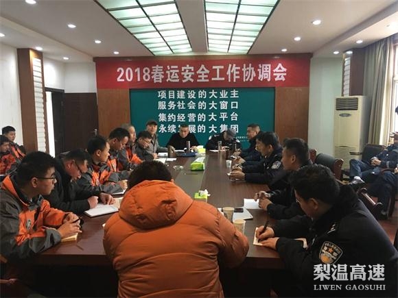 为了确保春运期间道路安全畅通,完善各涉路部门联勤联动机制,1月23日,由总经理助理付群主持,南昌南管理中心在杨梅岭养护站会议室召开了2018梨温路春运安全、应急保畅联勤联动工作协调会。高速交警五支队、上饶高速路政支队、中心安监处、东乡养护所及各养护站,共计20余人与会。