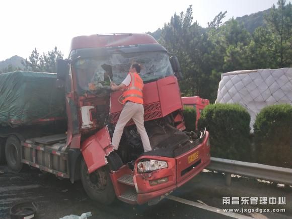 7月2日,沪昆高速玉山养护段K463+800公桩往南昌方向发生一起两大货车追尾事故,后车内有两人被困,情况十分危急。养护人员第一时间赶到事故现场进行施救,成功将被困人员救出。