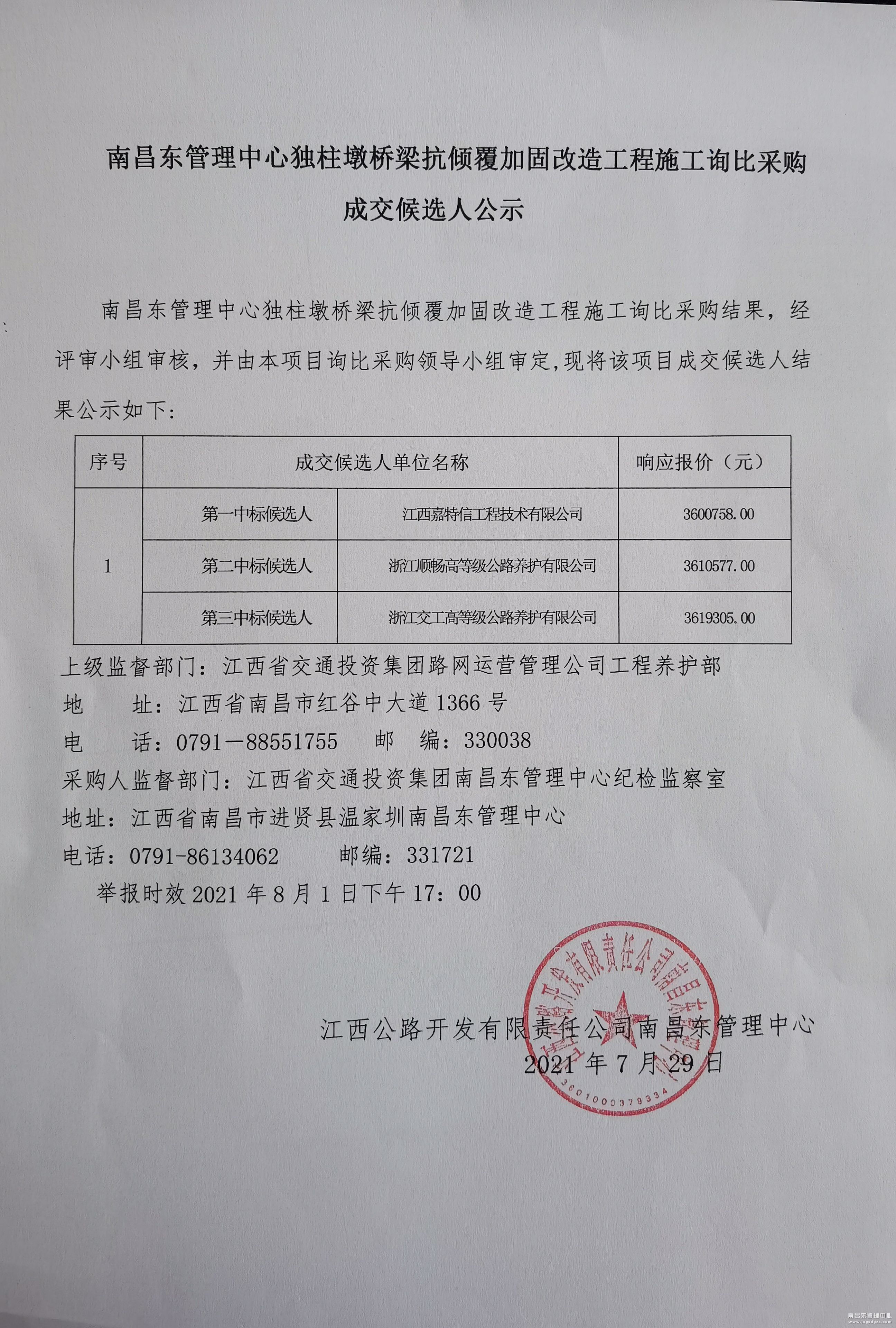 南昌南管理中心独柱墩桥梁抗倾覆加固改造工程施工询比采购成交候选人公示