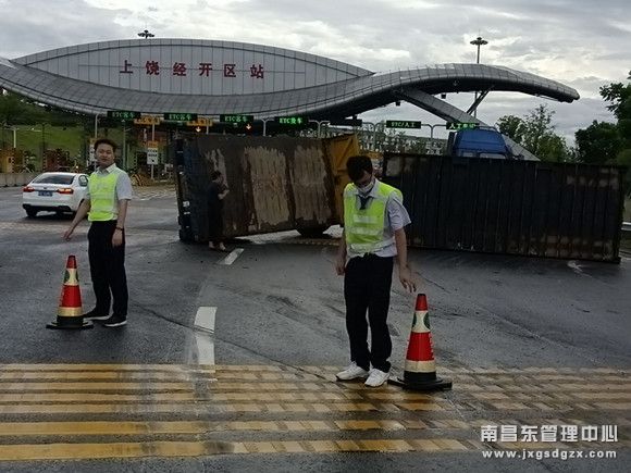 7月24日,受台风影响,南昌南管理中心上饶经开区收费站出现大风降雨天气,一辆集装箱货车从匝道进入该站收费广场时出现打滑侧翻,该站迅速处置,保障了事故车辆人员和过往司乘的安全。