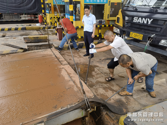凌晨1点10分,维护站技术员赶到上饶东收费站后立刻投入机电设备故障检修中。经过检查,发现是由于持续降水量过大,该站广场排水口无法完全排空积水,积水通过出口排水沟倒灌将三块地磅全部撑浮起来,地磅称台与基座分离,悬浮在水中,有的地磅已经脱离地磅基础坑,被水冲上了路面,存在重大行车安全隐患,地磅此时已无法再继续使用。