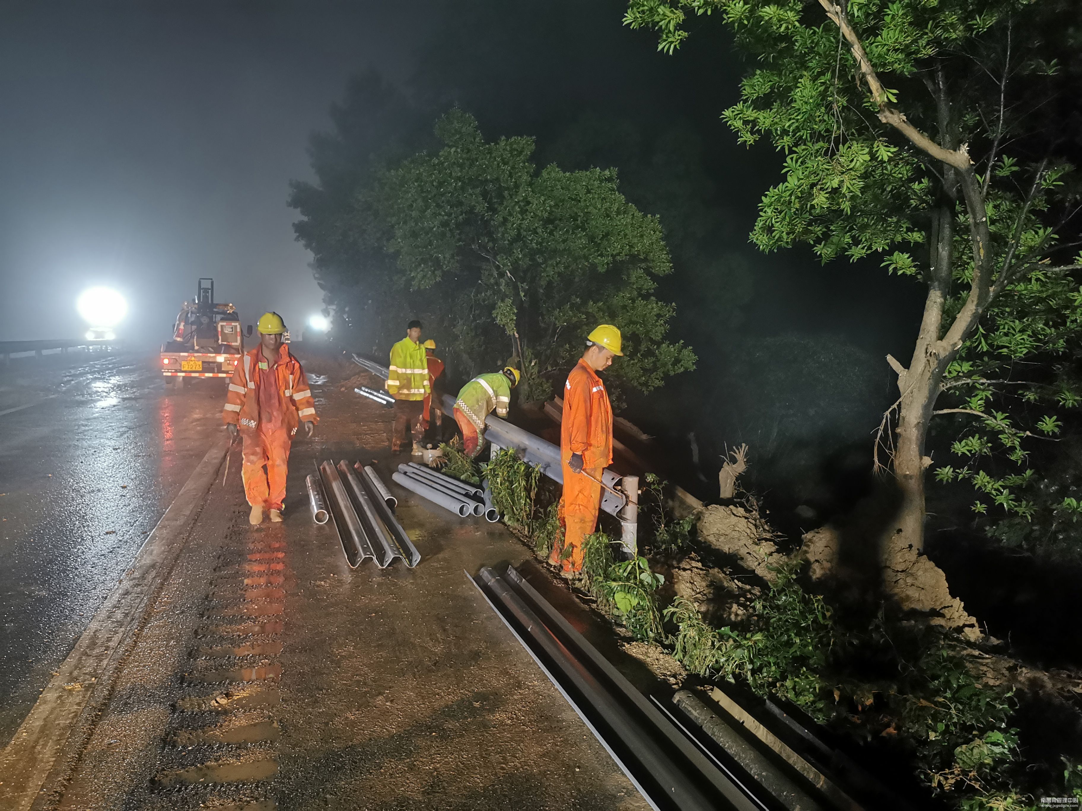 6月21日凌晨零点,路面塌方量基本清理完毕,交安设施维修队接到指令立即进场作业。受山体滑坡影响,事故现场护栏及立柱全部被冲毁,此时仍然下着暴雨,加上夜间能见度低加大了作业难度。为了尽快做好安保工作,该队人员冒着大雨紧急投入到抢修中,只见他们迅速分工,切割、打立柱、装托架、挂板、打螺栓、装柱帽、调整线行……每一道工序都有条不紊地快速进行着,不到两小时现场共安装新护栏300米,立柱75根,拆装中央活动式开口栅45米。