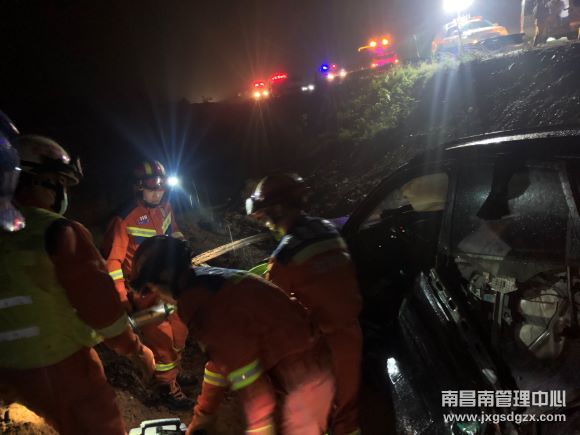 4月28日晚上18点10分左右,在沪昆高速南昌方向k637公桩处,一辆黑色的小车不幸冲出护栏外,车辆直接滚落边坡,独自开车的驾驶员陈师傅腿部骨折,南昌南管理中心余江中队紧急出动,成功将司机解救出来。