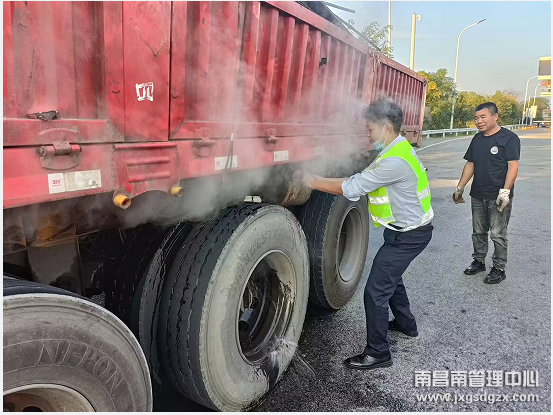 近日,南昌南管理中心双金收费站当班班长在收费广场巡查外场设备、设施时发现,一辆轮胎冒着烟雾的半挂牵引货车缓缓驶入出口104道,于是当班班长迅速引导司机开到收费站广场外指定位置停靠并查看异常情况。为了不影响其它车辆通行,当班班长摆好反光锥,立即提起灭火器冲向冒烟的位置。